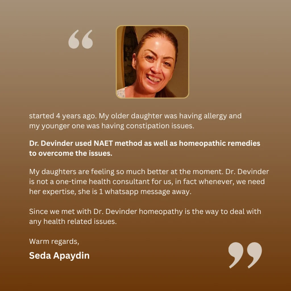 I wanted to express my gratitude for your recent guidance and support. Your expertise in homoeopathy has been incredibly helpful. My kids and 1 noticed positive changes in our health with no side effects on any of the medications you have prescribed.