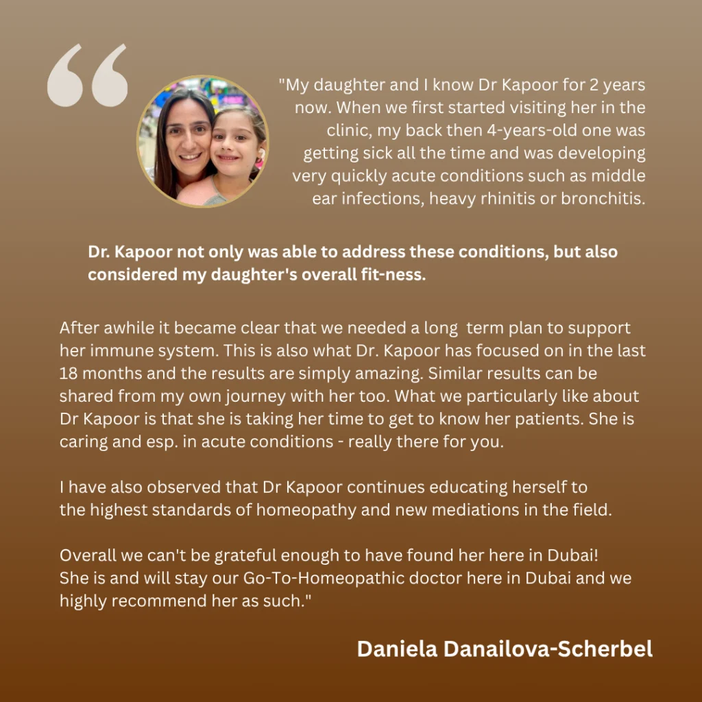 With 20+ years of clinical experience in homeopathy and holistic medicine, Dr. Devinder Kapoor is your trusted partner for natural healing and long-term wellness in Dubai, UAE. Her approach focuses on addressing the root causes of health concerns, using safe, evidence-based homeopathic treatments combined with modern holistic diagnostic tools.